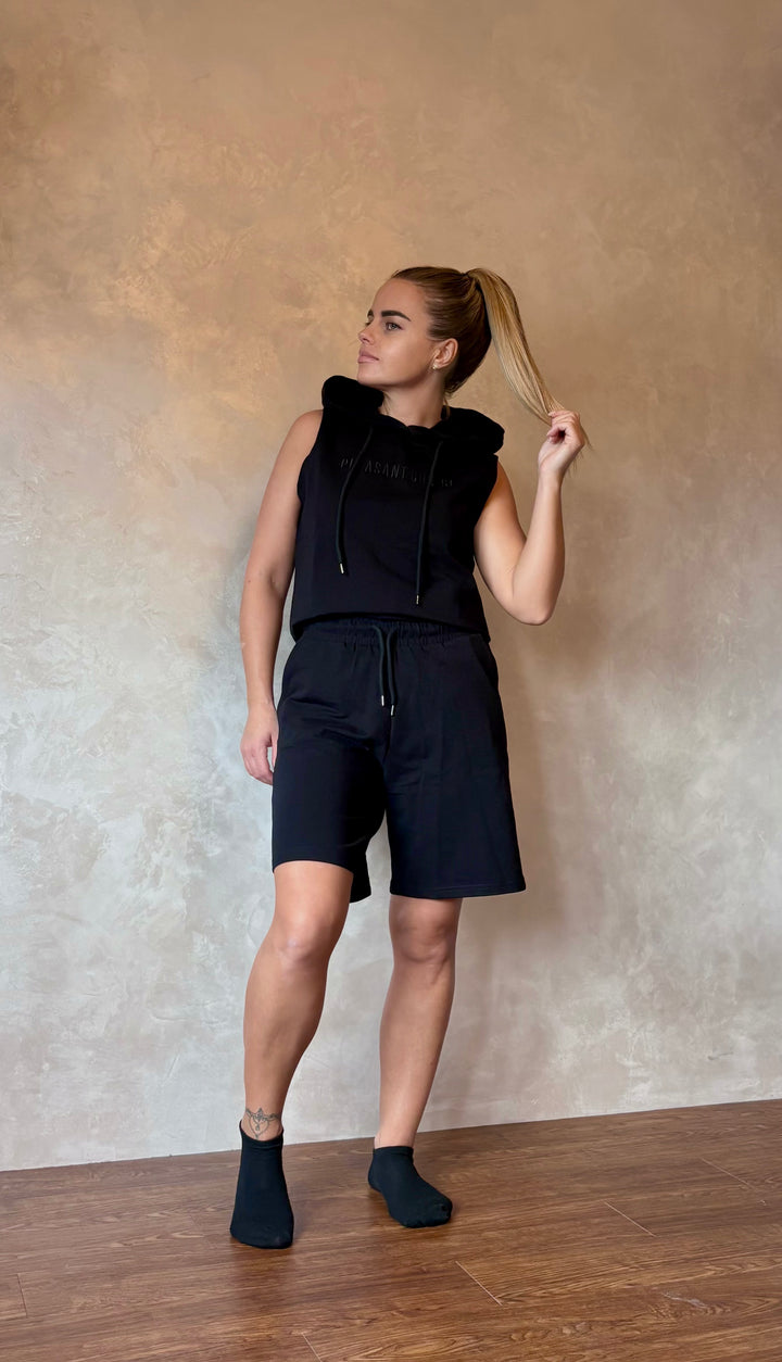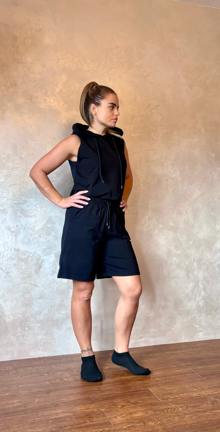 Tailored for understated confidence, this black two-piece set offers a perfect harmony of clean lines and relaxed structure. The sleeveless hoodie is designed with gently padded shoulders and a refined drawstring hood, while the mid-length shorts feature a comfortable elasticated waistband with subtle pleating for a streamlined fit.
