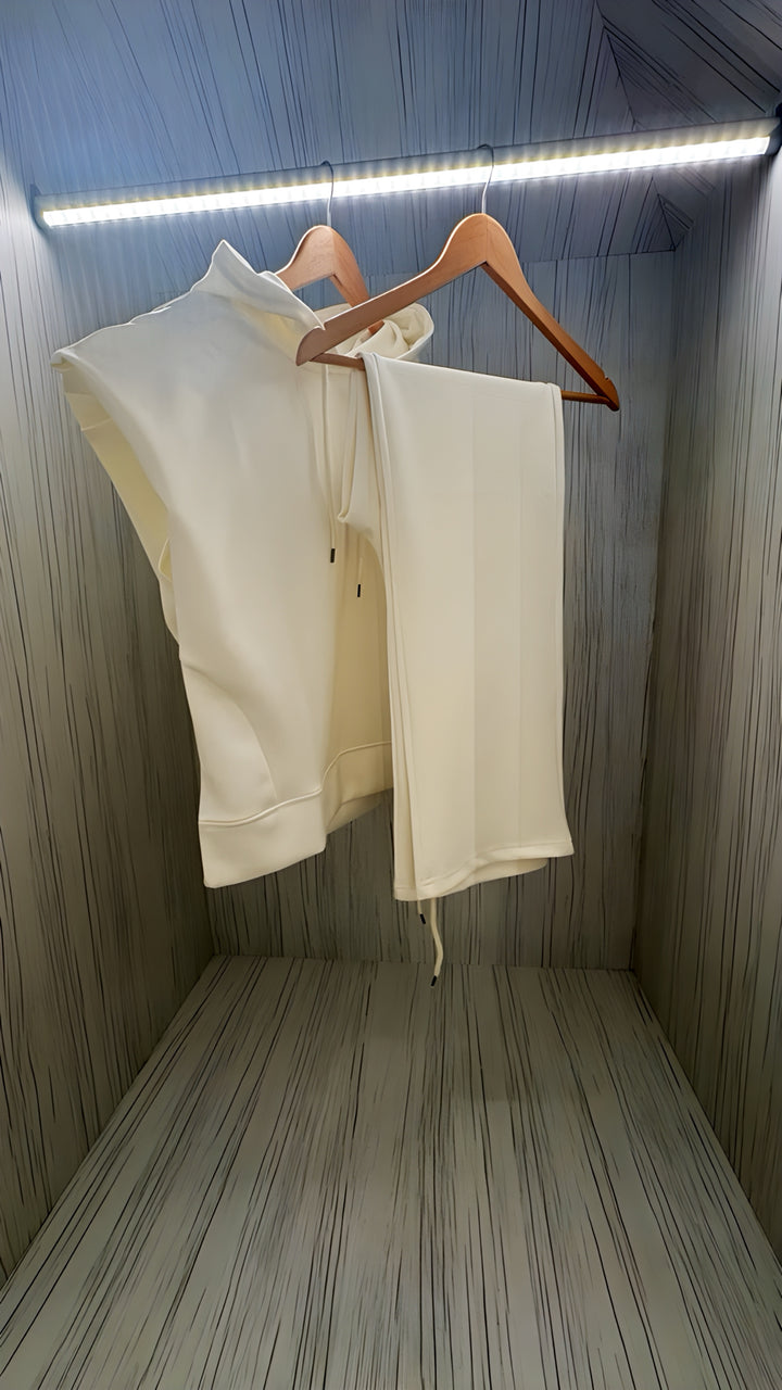The sleeveless hoodie features gently padded shoulders and a refined drape, while the straight-leg trousers sit high on the waist with an elasticated waistband for an effortless fit. Perfectly balanced between casual and polished, this set reflects the essence of understated style.