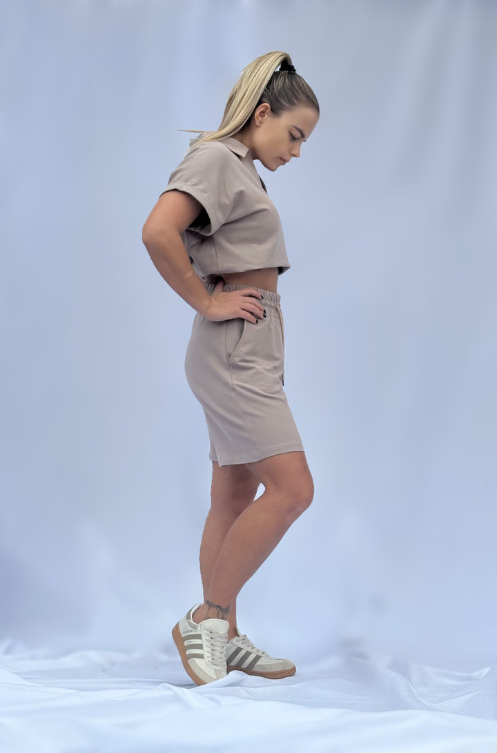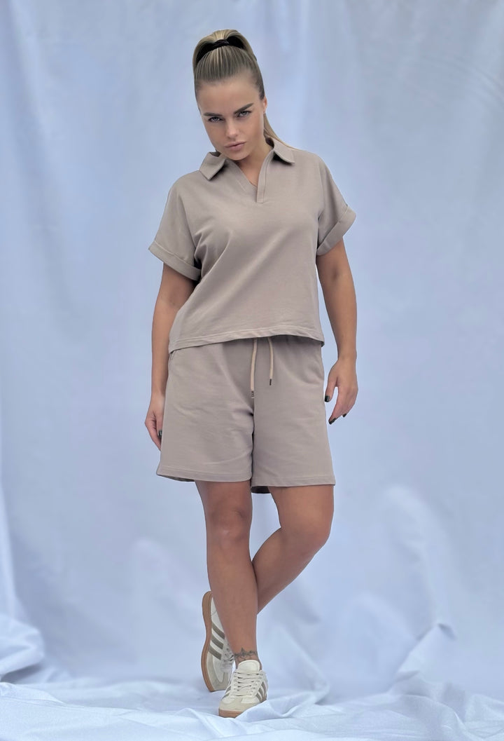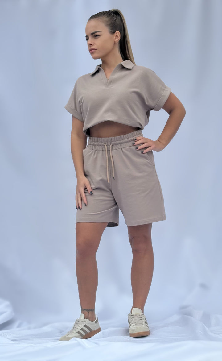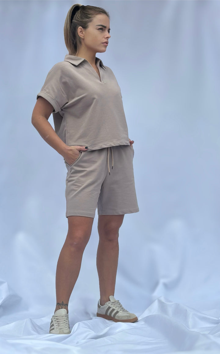 A minimalist and elegant summer set made from soft cotton jersey. The top features a relaxed polo-style shirt with a collar and short sleeves, while the shorts have a mid-thigh length and a high-rise elastic waistband with adjustable drawstrings. The tailored silhouette subtly highlights the waist, and the natural beige tone flatters sun-kissed skin and pairs effortlessly with any wardrobe.