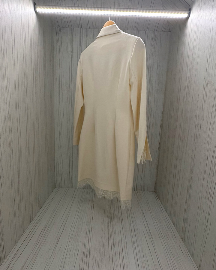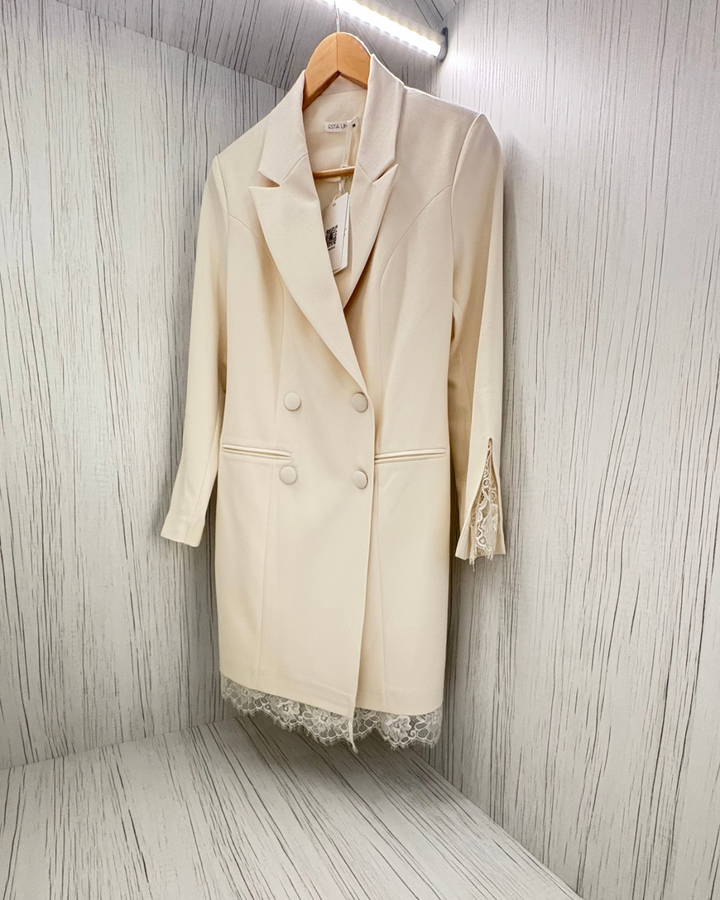 A refined knee-length blazer dress crafted in a structured silhouette with soft tailoring. Designed in a delicate cream shade, it features a double-breasted front, sharp lapels, and tonal buttons for a clean, sophisticated look. Subtle lace inserts on the cuffs and hem lend a touch of femininity and modern elegance.