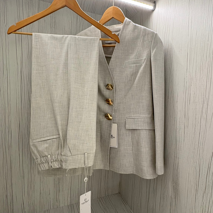 Tailored from a textured ivory fabric, this elegant two-piece suit features a minimalist collarless blazer with sculptural gold-toned buttons and sharply cut trousers. A timeless silhouette, designed to elevate your everyday wardrobe.