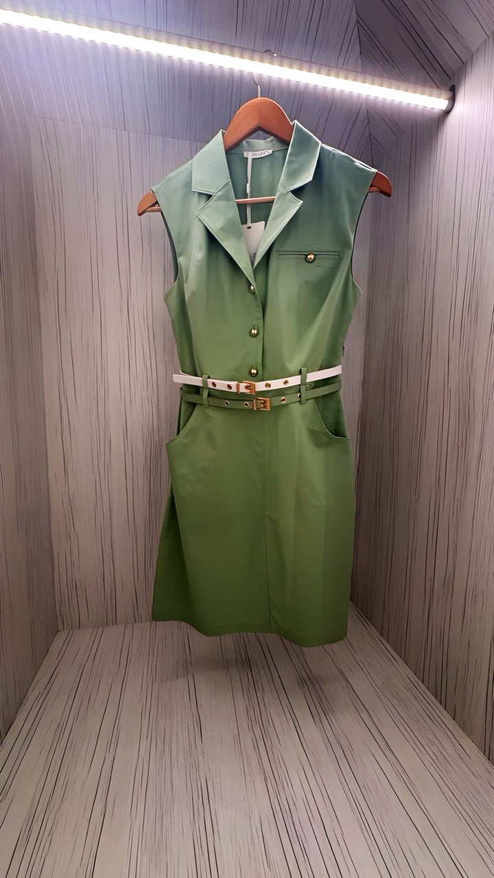 Crafted from a structured yet supple stretch-cotton blend, this mint green dress redefines everyday elegance. The sleeveless silhouette, tailored seams, and lapel collar create a clean, refined look — elevated by the subtle sheen of the fabric and a polished waist belt.