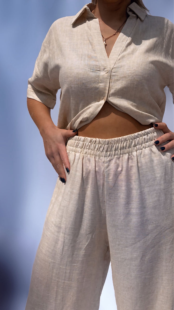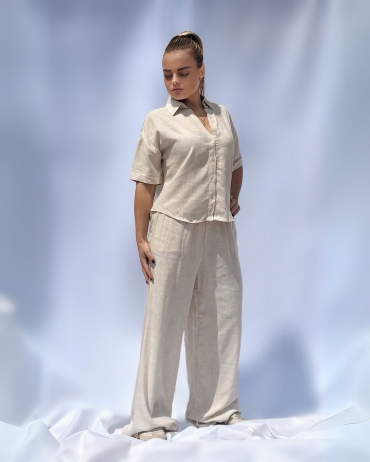 This two-piece outfit is the definition of refined summer minimalism — crafted in a breathable, flowing fabric with a soft linen texture. The neutral beige tone, relaxed fit and tailored silhouette make it a go-to set for everyday elegance.
