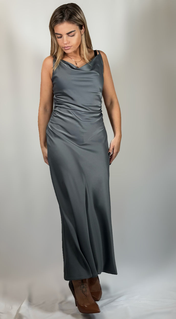 A sleek, draped maxi dress in a rich charcoal satin. Designed for the modern woman who values simplicity with quiet confidence. This piece flows with the body, offering a soft, flattering fit and graceful silhouette. Gentle gathering at the waist adds subtle structure without compromising comfort. Perfect for both refined day looks and understated evening moments.