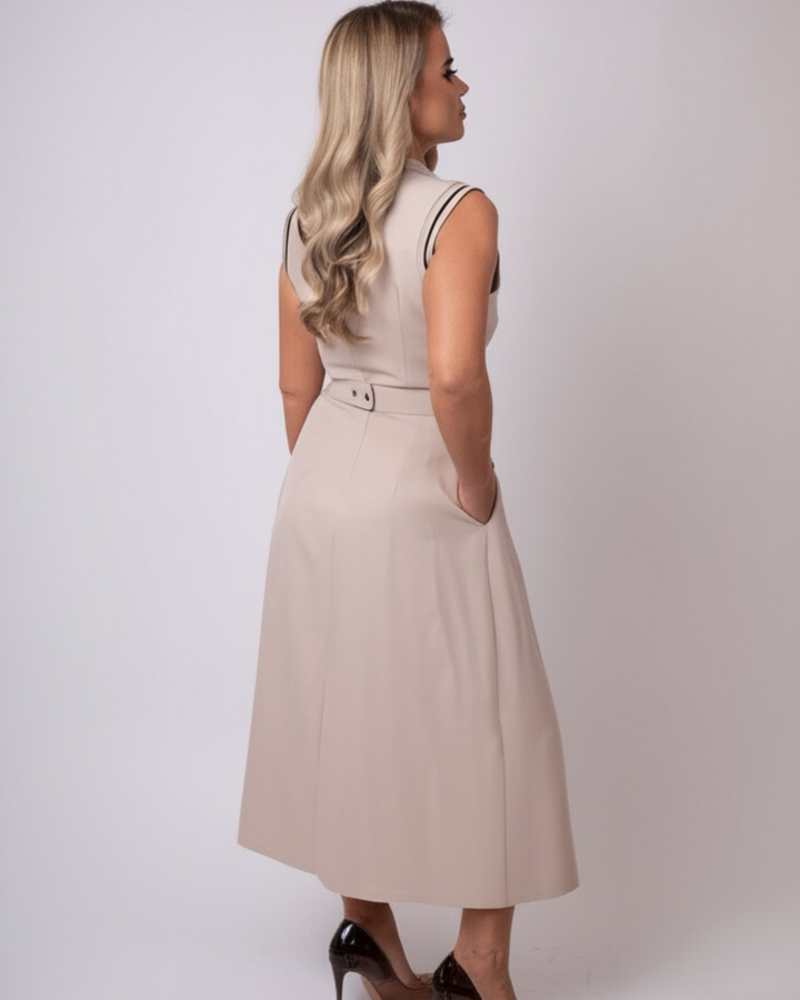 A refined and elegant sleeveless midi dress crafted from high-quality structured fabric. Designed in a soft sand beige tone, this piece offers timeless sophistication with a minimalist twist. Its tailored silhouette features a sleek zip-up front and a tonal fabric belt that cinches the waist, creating a flattering, feminine shape.