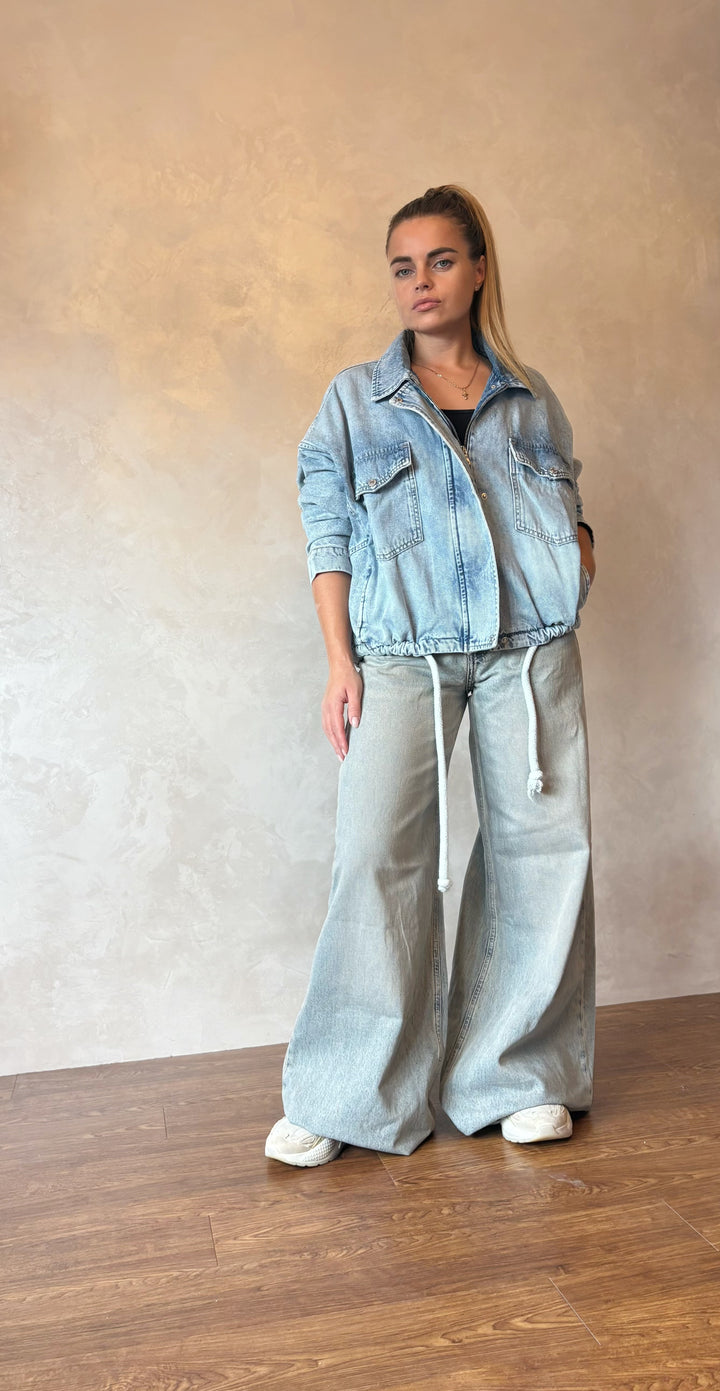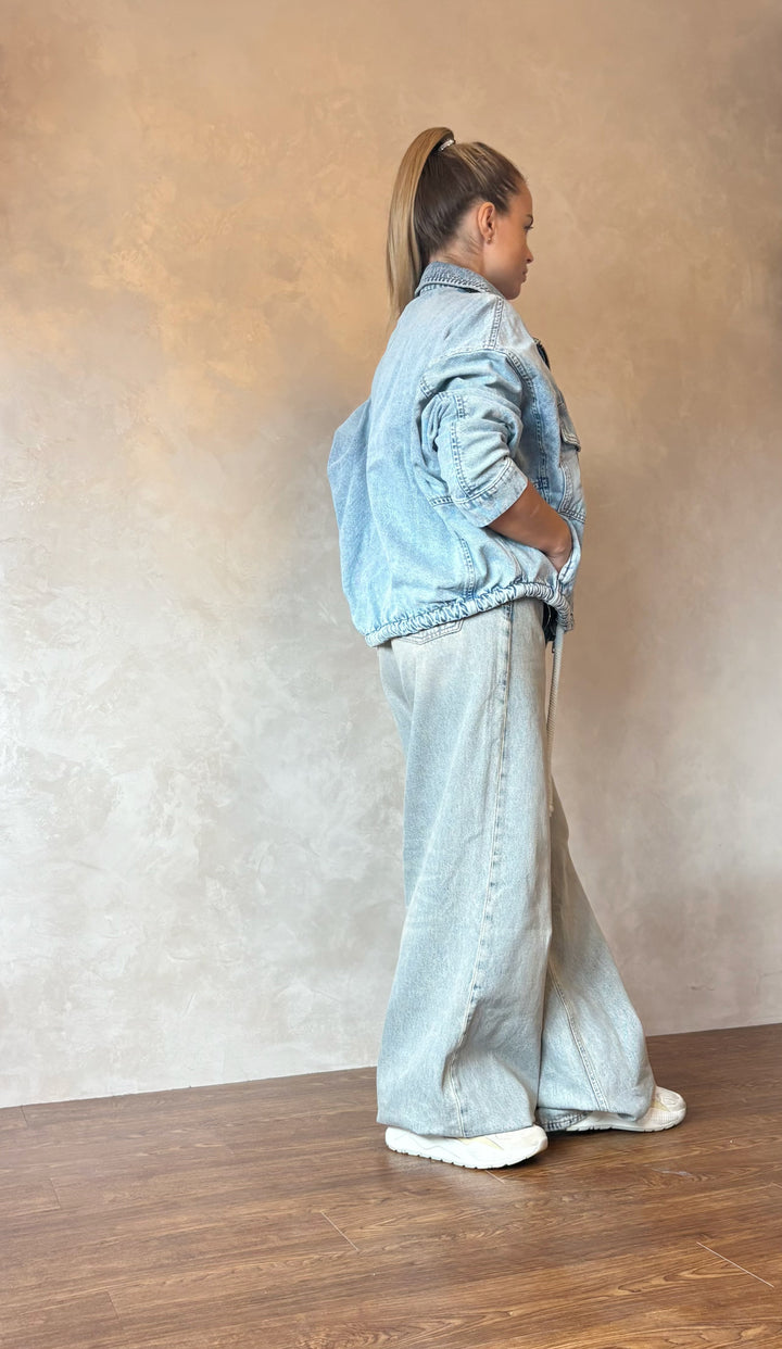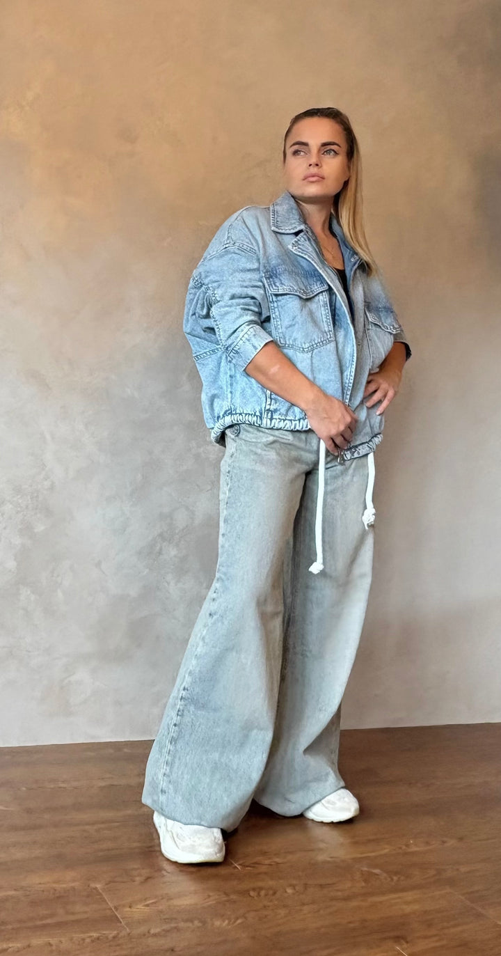 This light-washed denim jacket blends a utilitarian silhouette with understated sophistication. Cut from 100% cotton, it features an oversized fit with gently dropped shoulders, structured collar, and practical patch pockets. The adjustable drawstring hem adds a subtle touch of tailoring, allowing the piece to be worn loose or cinched for a more defined shape.