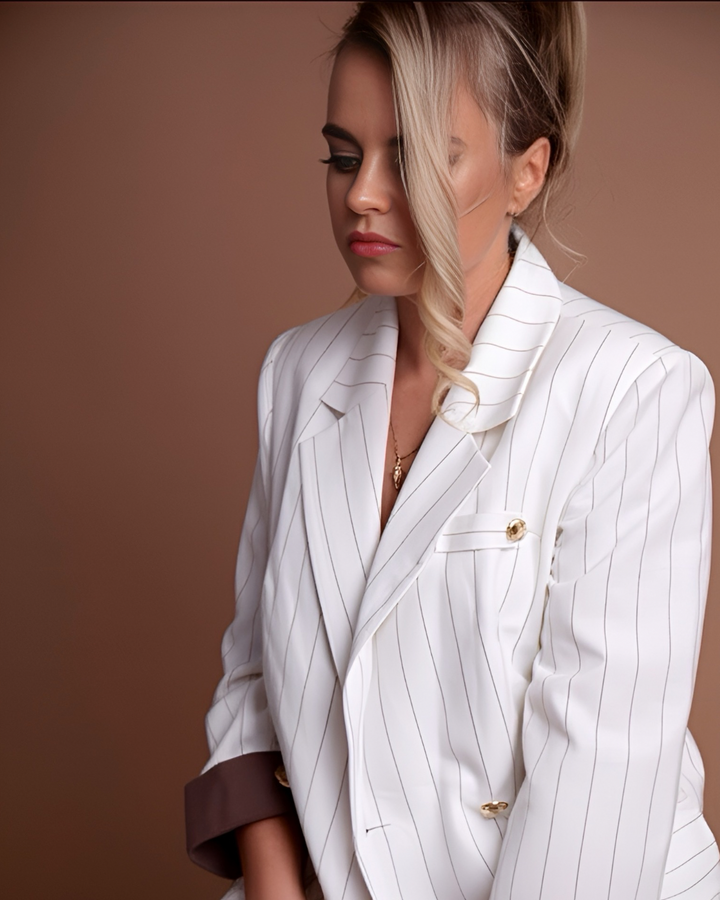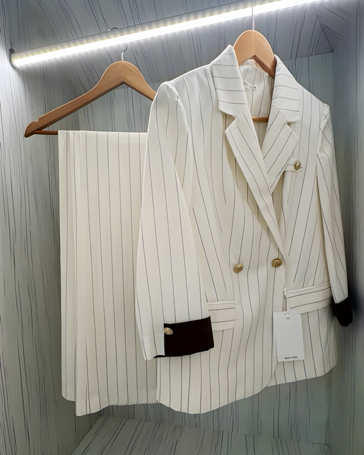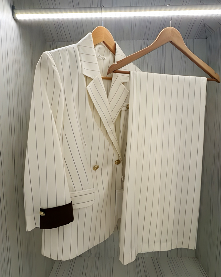 An elegant women’s suit made from 100% natural linen — the perfect blend of refined style and comfort. The design features a soft off-white base with fine vertical stripes that visually elongate the silhouette. Contrasting cuffs and gold-tone buttons add a touch of sophistication and polish to the look.